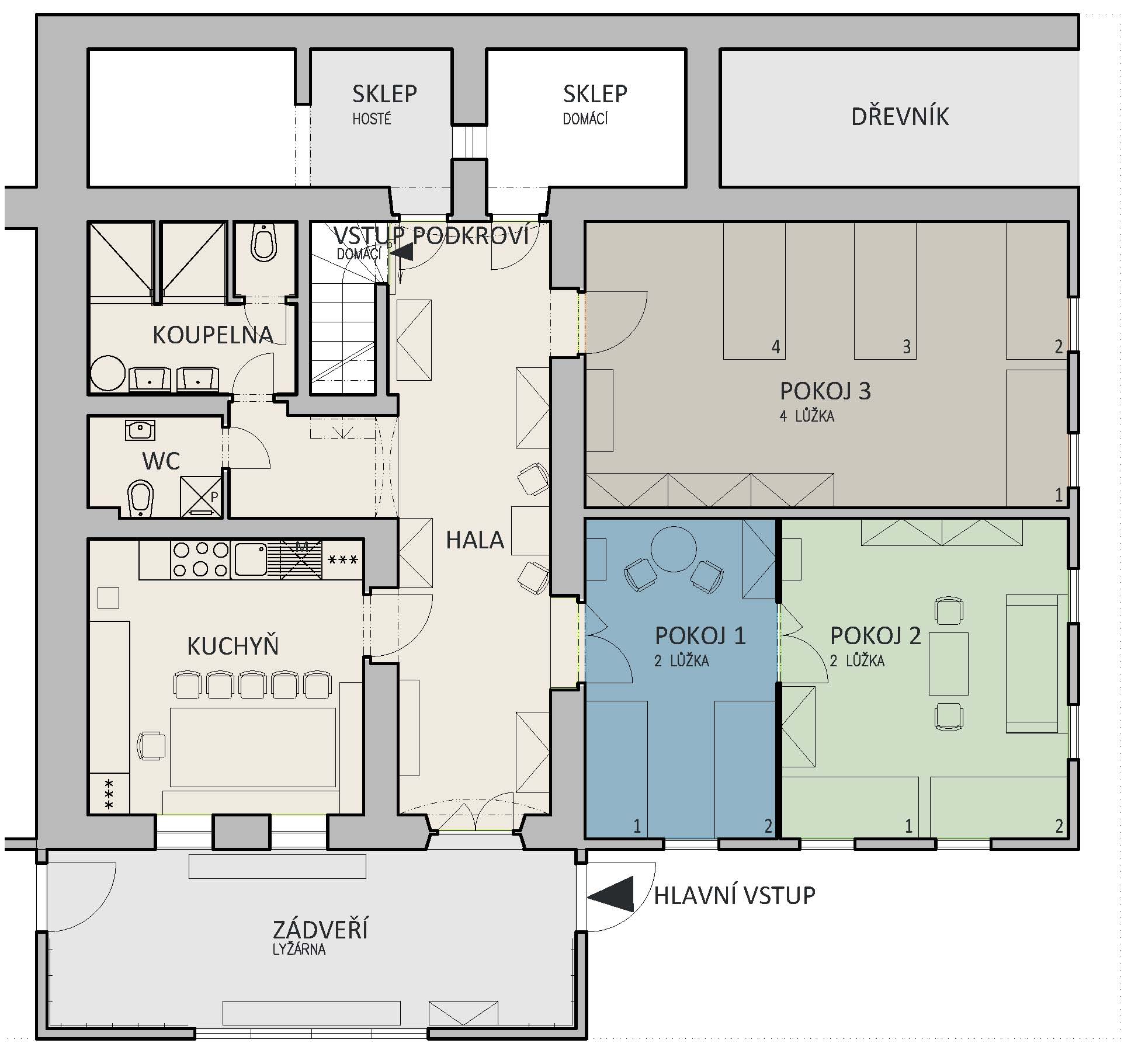Kuchyň je velká, používá se jako společenská místnost. Tři pokoje s televizí, akumulační kamna. Zádveří se v zimě používá jako lyžárna. Také si tu můžete zahrát stolní tenis, fotbálek nebo šipky.